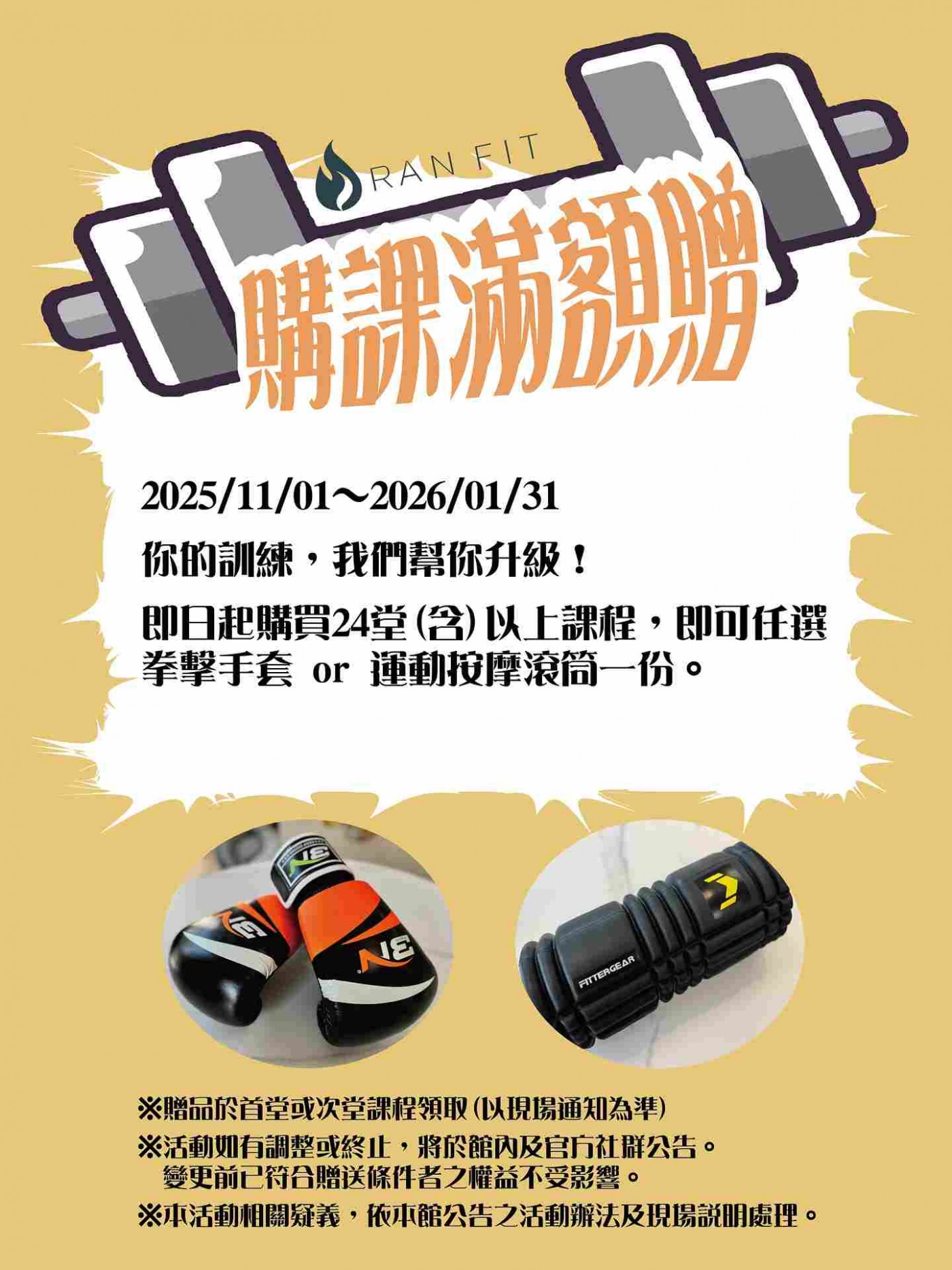 從 2025/11/01 起至 2026/01/31, 凡購買 24 堂(含)以上課程, 即可任選一份教練精選的訓練贈品: